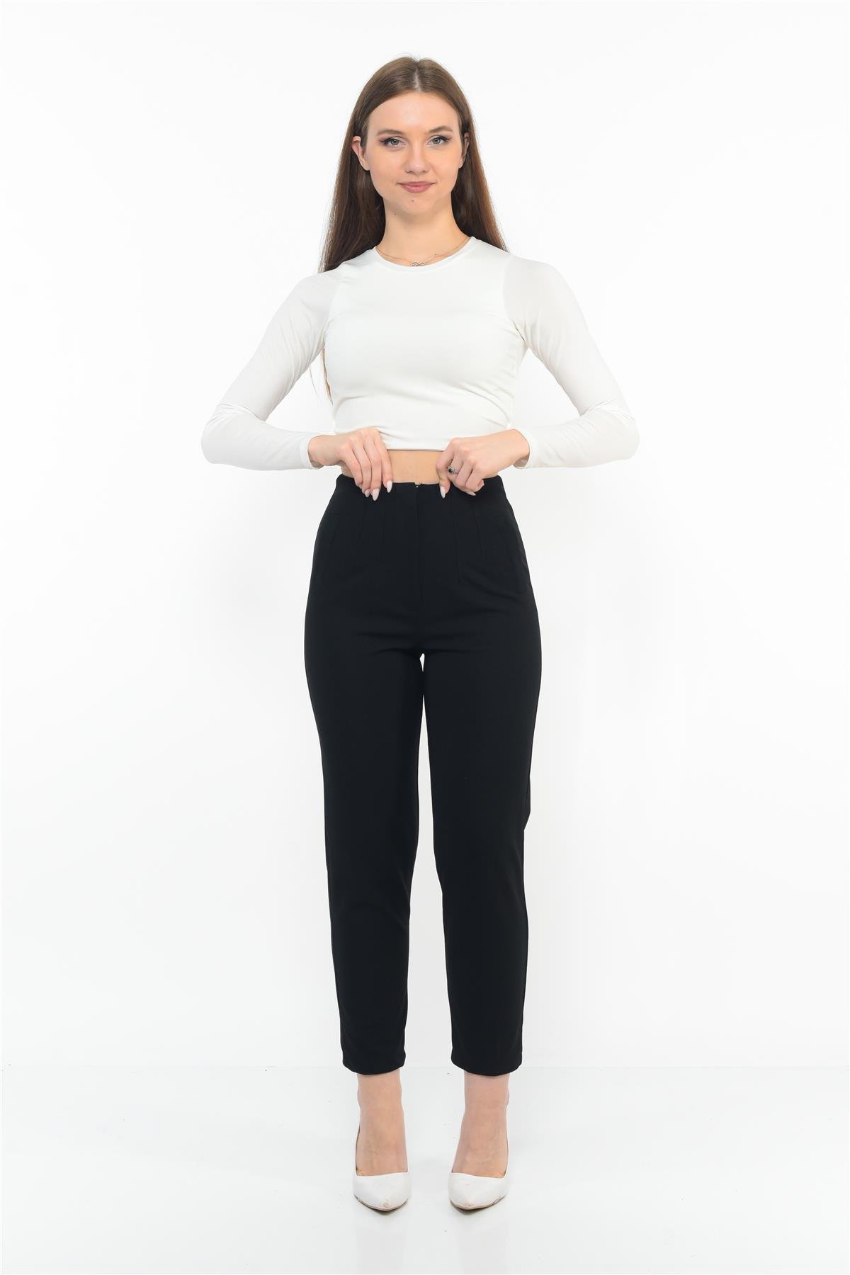 Kadın Likralı Yüksek Bel Önden Cep Detaylı Zara Model Pantolon Siyah (DGMSC1033Siyah)